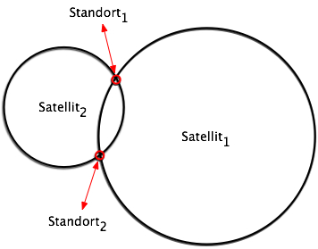 Diese Angaben reichen dann bereits, die unsere Position zu bestimmen: Da die Satelliten ja Ihren Standort mitgeschickt haben, und wir die Entfernung zu den beiden Satelliten kennen (mit der eben beschriebenen Methode), brauchen wir nur nach dem Ort zu fragen, der von den beiden Satelliten die bekannte Entfernung hat. Wenn man sich das Ganze zweidimensional vorstellt, dann sieht es so aus, wie auf dem nebenstehenden Bild.