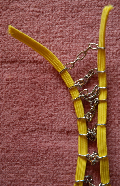 Die Räder drehen im Schnee oft durch, oder man hält das Auto in der Luft und gibt testweise Gas. In beiden Fällen drehen sich die Räder sehr schnell und dadurch wirken auf die Schneeketten enorme Zentrifugalkräfte, sodass sie wegfliegen oder gar reißen und einem um die Ohren (bzw. in die Augen) fliegen können. Gerissen ist uns keine, aber weggeflogen sind sie manchmal, einmal mitten auf einem zugefrorenen See. Preisfrage: Hält das Eis auch einen echten Menschen aus? (Diesmal ja.)