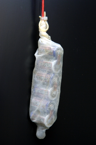 Die Empfangseinheit haben wir komplett in einen Kondom gesteckt, diesen mit Kabelbinder verschlossen, das Ganze mit Klebeband gesichert und mit Servoklett und einem Kabelbinder befestigt. Das scheint ein bisschen viel der Befestigung, aber Kondome haben eine antihaftende Beschichtung, die leider die Wirkung von fast jeder Form von Kleber oder Klebeband vollständig aufhebt. Wer das nicht mag, der kann die klassische Methoden verwenden und einen Luftballon als Wasserschutz einsetzen. Aber Vorsicht: Da man ja das Kabel herausführen muss, verbleibt immer eine kleine Öffnung, durch die potenziell Wasser eindrigen kann. Außerdem entsteht durch die Temperaturunterschiede fast mit Sicherheit Kondenswasser, das die Elektronik bereits stören wenn nicht gar schädigen kann. Als Abwehrmaßnahme kann man den Empfänger zuvor in Kückenkrepp einwickeln und eventuell ein kleines Beutelchen Wasserabsorbtionsmittelchen mit einpacken, wie es bei elektronischen Geräten oft beiliegt. Angeblich soll es auch mit Reis funktionieren, das man in einen Kaffeefilter einpackt, aber wir haben es nicht probiert.